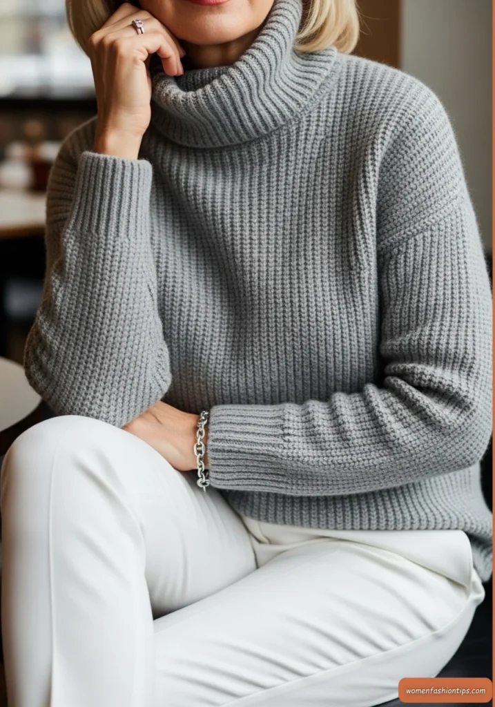 The timeless appeal of a chunky gray turtleneck cannot be overstated, especially when paired with crisp white pants that create a sophisticated monochromatic palette with subtle contrast. This ensemble embodies the essence of effortless elegance – the kind of look that appears simple but is actually quite thoughtfully constructed. The thick knit of the sweater provides both warmth and texture, while the clean lines of the white pants elongate the silhouette and create a fresh, modern aesthetic.