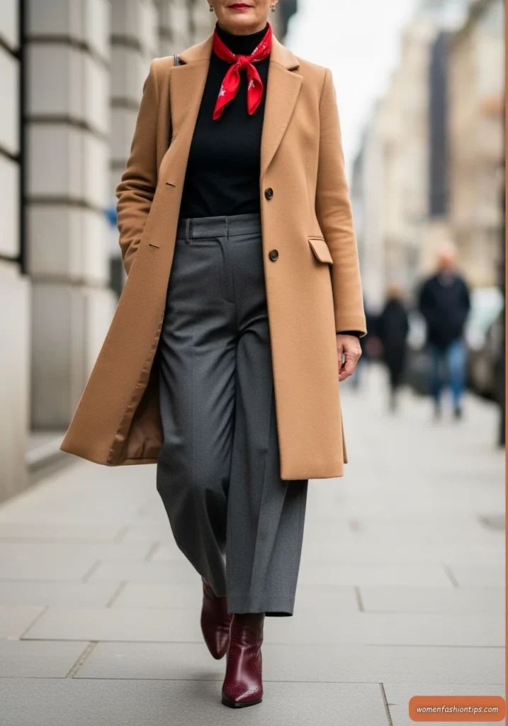 The camel coat is arguably one of the most versatile and flattering pieces in any mature woman’s wardrobe, and this styling showcases exactly why it’s considered a timeless classic. Layered over a sleek black turtleneck, the coat creates a sophisticated silhouette that’s both professional and approachable. The wide-leg gray trousers add a modern touch while providing comfort and elegant movement, and the burgundy ankle boots introduce a rich, jewel tone that complements the warm camel beautifully.