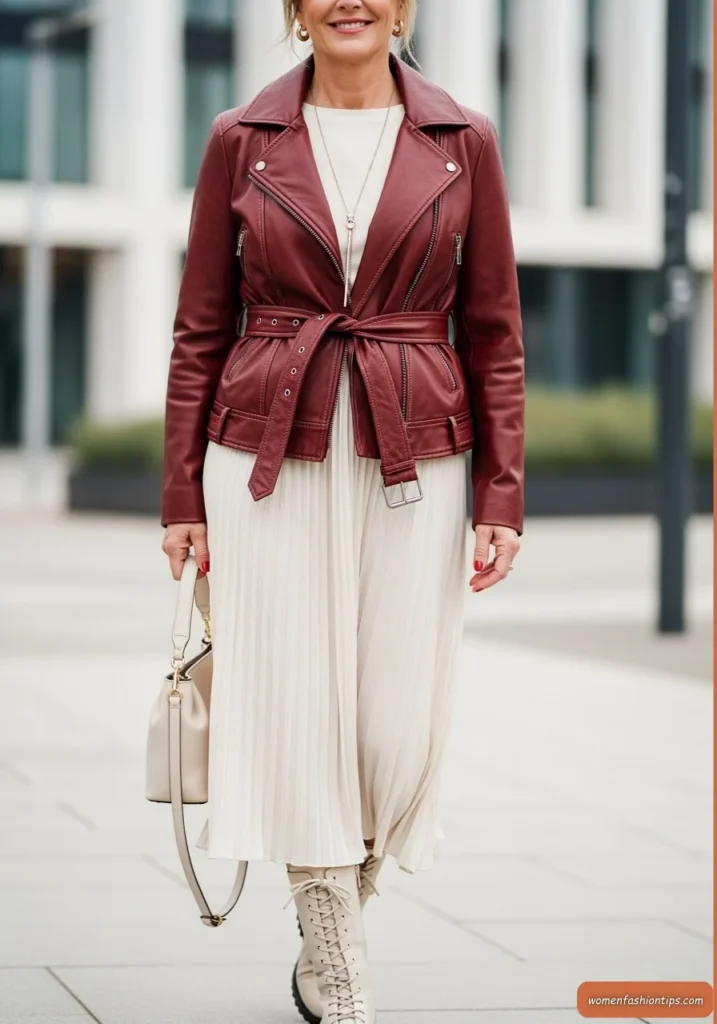 The perfect marriage of feminine and edgy, this ensemble proves that mature women can absolutely rock a leather jacket with grace and sophistication. The wine-red color elevates the classic moto jacket into something more refined and elegant, while the belted waist creates a flattering silhouette. Paired with a flowing cream pleated dress, the contrast between hard and soft elements creates visual interest and demonstrates fashion confidence.