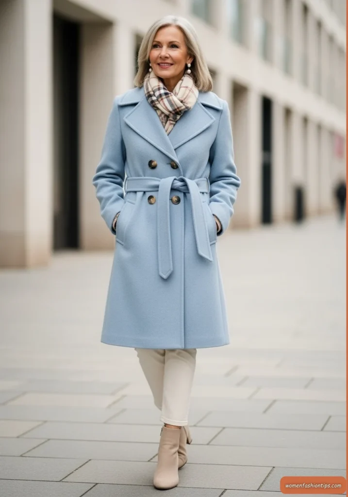 Soft, powder blue brings a fresh, sophisticated energy to winter dressing, especially when featured in a beautifully tailored belted coat. The gentle hue is incredibly flattering and creates a serene, elegant impression while the structured silhouette provides both warmth and style. The plaid scarf introduces pattern and texture while staying within a complementary color palette, and the cropped ivory jeans add a modern, relaxed element to the polished coat.