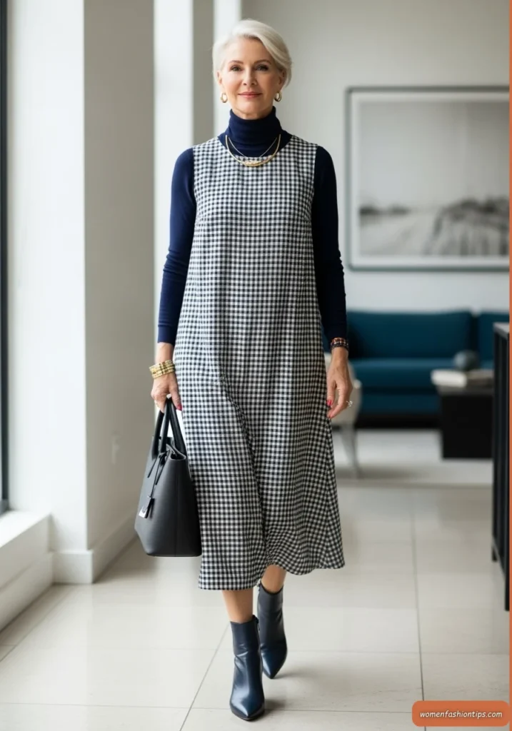 The classic combination of navy and white gets a sophisticated update with this layered approach that showcases the versatility of pattern mixing. The navy turtleneck provides both warmth and a sleek foundation for the gingham print dress, creating a look that’s both practical for cooler weather and visually interesting. The pointed navy ankle boots elongate the leg while echoing the deeper tones of the turtleneck.