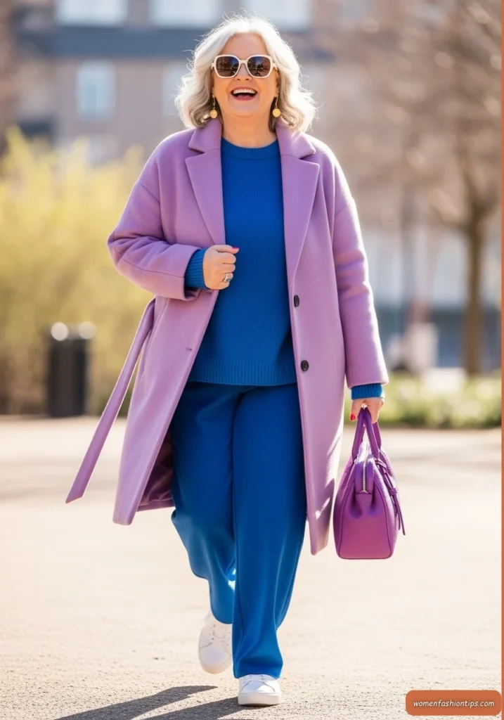 Bold color coordination takes center stage in this joyful ensemble that celebrates the beauty of saturated hues. The cobalt blue sweater and trouser set creates a striking monochromatic foundation, while the oversized lilac coat introduces a complementary purple tone that’s both unexpected and harmonious. This approach to color blocking is sophisticated and confident, perfect for women who want to embrace vibrant colors in their mature wardrobe.