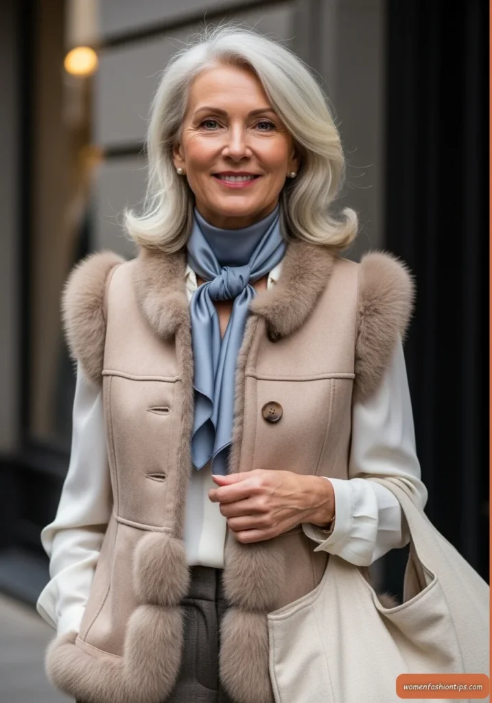 Quiet luxury takes center stage in this beautifully composed ensemble featuring a vintage-inspired beige vest with sumptuous fur trim. The neutral palette speaks to sophisticated taste while the luxurious textures add depth and visual interest. The crisp white blouse provides a classic foundation, while the soft silk scarf in muted blue introduces a gentle pop of color that feels both elegant and unexpected.