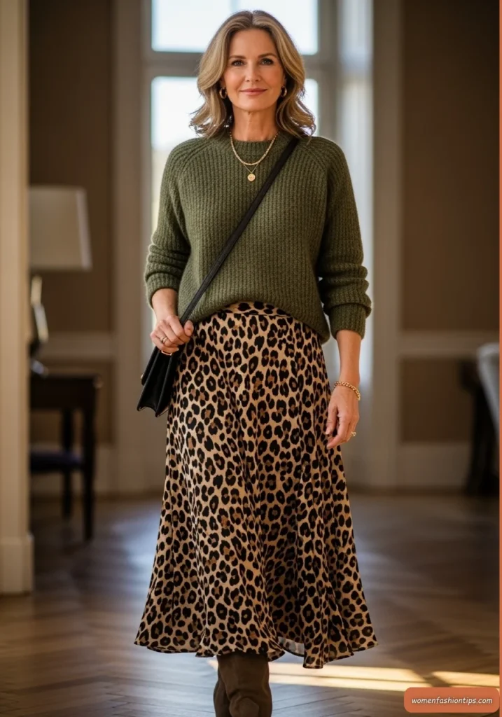 The art of mixing patterns and textures reaches sophisticated heights in this beautifully balanced ensemble. The rich olive green sweater provides a luxurious, cozy foundation while the flowing leopard print skirt adds movement and visual interest. This combination demonstrates how animal prints can be styled elegantly for mature women – the flowing silhouette of the skirt feels feminine and graceful rather than overly bold or trendy.