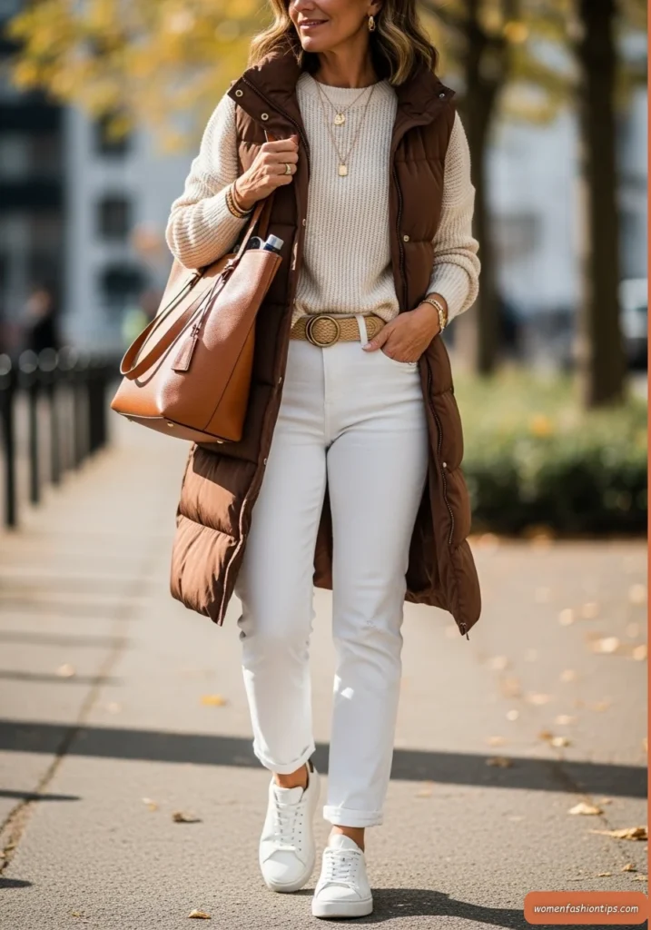 The humble puffer vest gets an elegant upgrade in this rich brown tone that pairs beautifully with crisp white jeans and a soft, light-colored sweater. This look proves that casual doesn’t have to mean sloppy – the belted waist of the vest creates a defined silhouette while providing practical warmth for your core. The choice to wear sneakers keeps the outfit grounded and comfortable, making it perfect for active days when you’re on your feet but still want to look put-together.