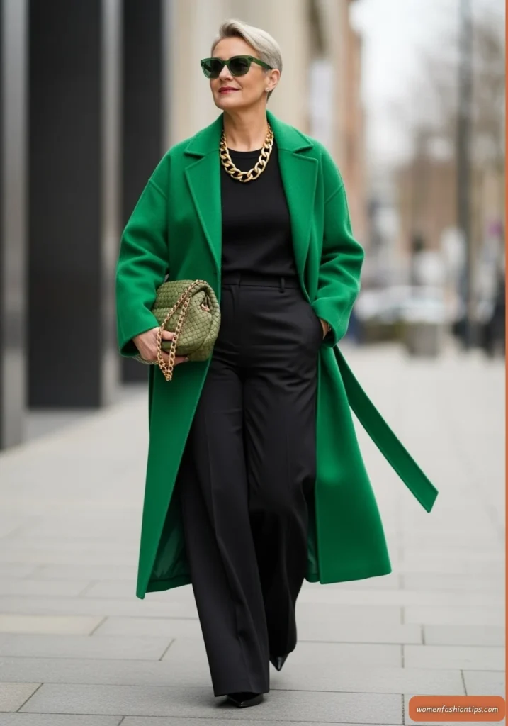 A statement coat in rich forest green transforms simple black basics into a look of urban sophistication and confidence. The long silhouette of the coat creates an elegant, elongating line while the deep green hue adds richness and depth to the outfit. Paired with sleek black fundamentals and wide-leg trousers, this ensemble strikes the perfect balance between comfort and polish.