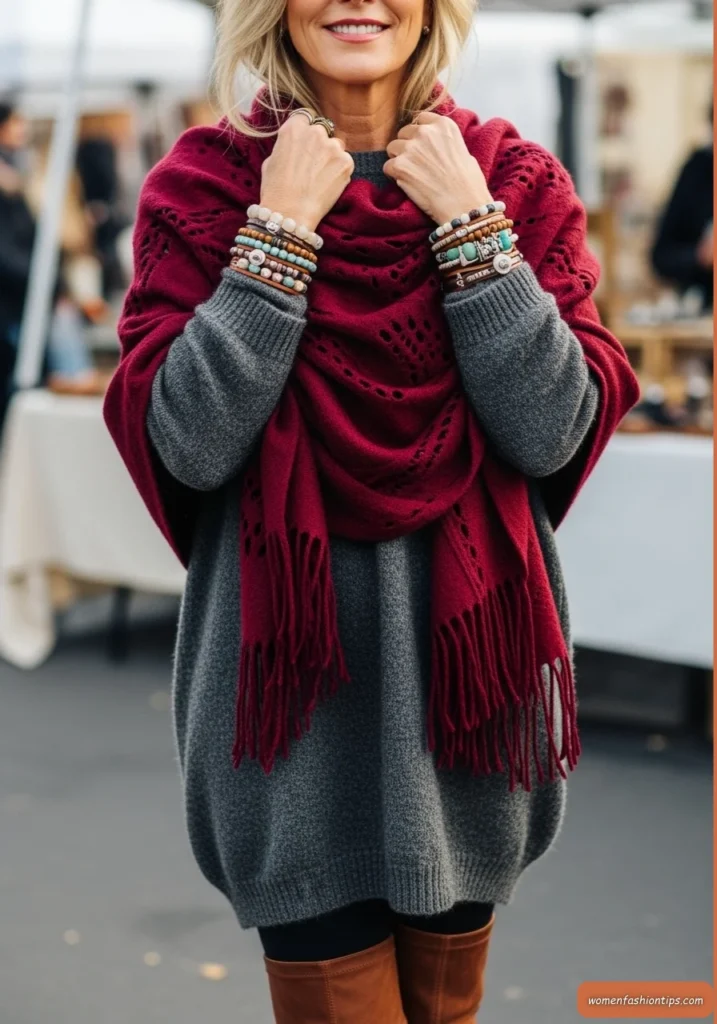 Bohemian influences get a sophisticated makeover in this richly textured ensemble that celebrates artisanal craftsmanship and creative expression. The burgundy shawl serves as both a practical layer and a statement piece, its rich color and flowing drape adding drama and visual interest. The oversized sweater dress provides comfort and ease while maintaining an elegant silhouette, and the knee-high boots add structure and sophistication to the relaxed bohemian vibe.