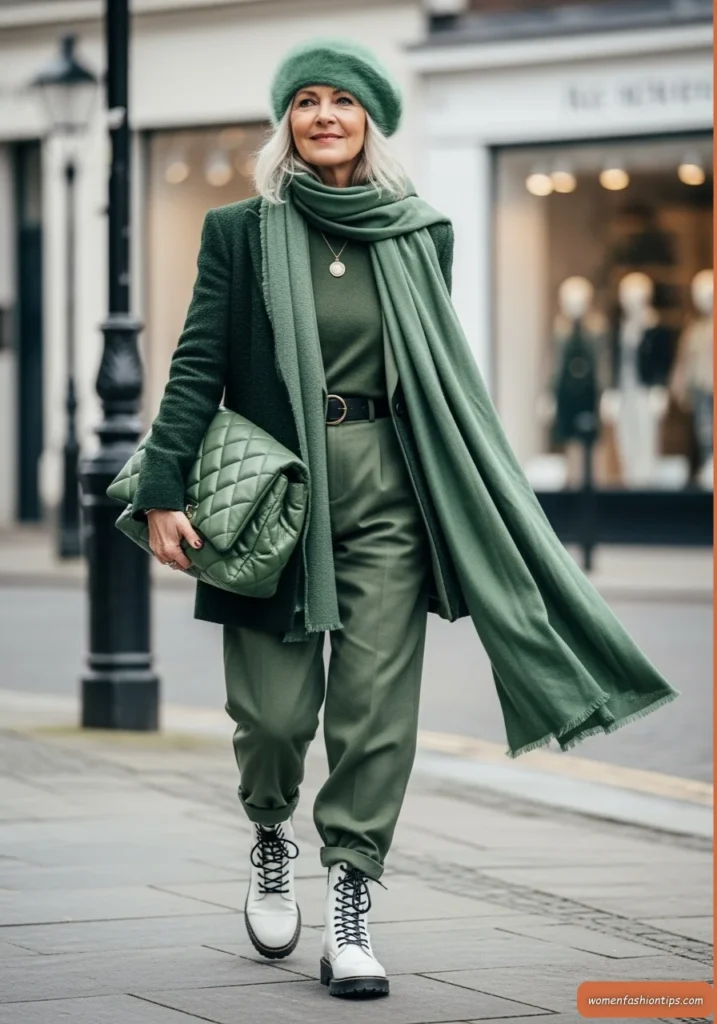 Monochromatic dressing in rich forest green creates a striking and cohesive look that’s both bold and sophisticated. The various shades and textures of green work together harmoniously, from the fluffy beret to the long, cozy scarf and relaxed tailored pieces. This approach to color coordination is particularly flattering for mature women as it creates a streamlined, elongating effect while still offering visual interest through varied textures and layering.