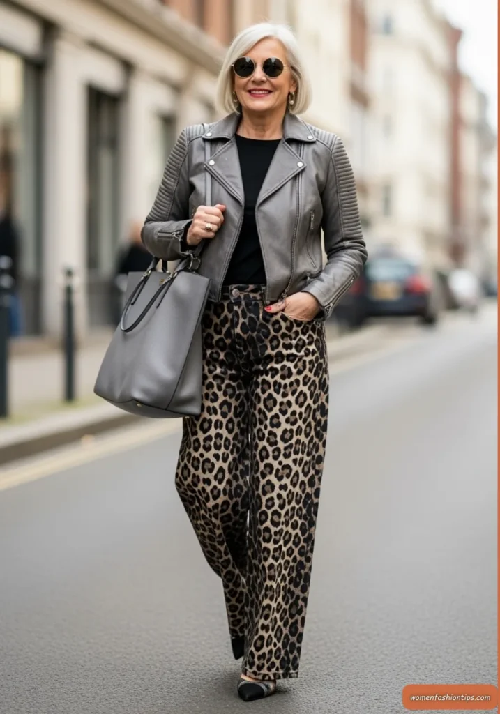 Animal prints get a sophisticated makeover when styled with sleek neutrals and modern silhouettes. The gray biker jacket provides an edgy foundation while remaining elegant enough for mature sensibilities, and the leopard print jeans make a bold statement when executed in wide-leg proportions that are both comfortable and fashion-forward. The pointed shoes add polish and elongate the leg, creating a flattering silhouette.