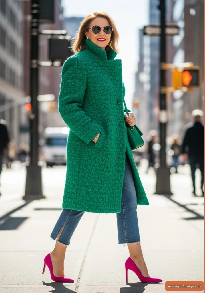 Nothing says confident style quite like a woman who isn’t afraid of color, and this vibrant teal textured coat proves that bold hues are absolutely perfect for the mature wardrobe. The rich, jewel-toned green creates a striking silhouette while the cropped jeans add a modern, casual touch that keeps the look from feeling too formal. The bright pink heels are the perfect unexpected pop of color that elevates the entire ensemble from simple to spectacular.