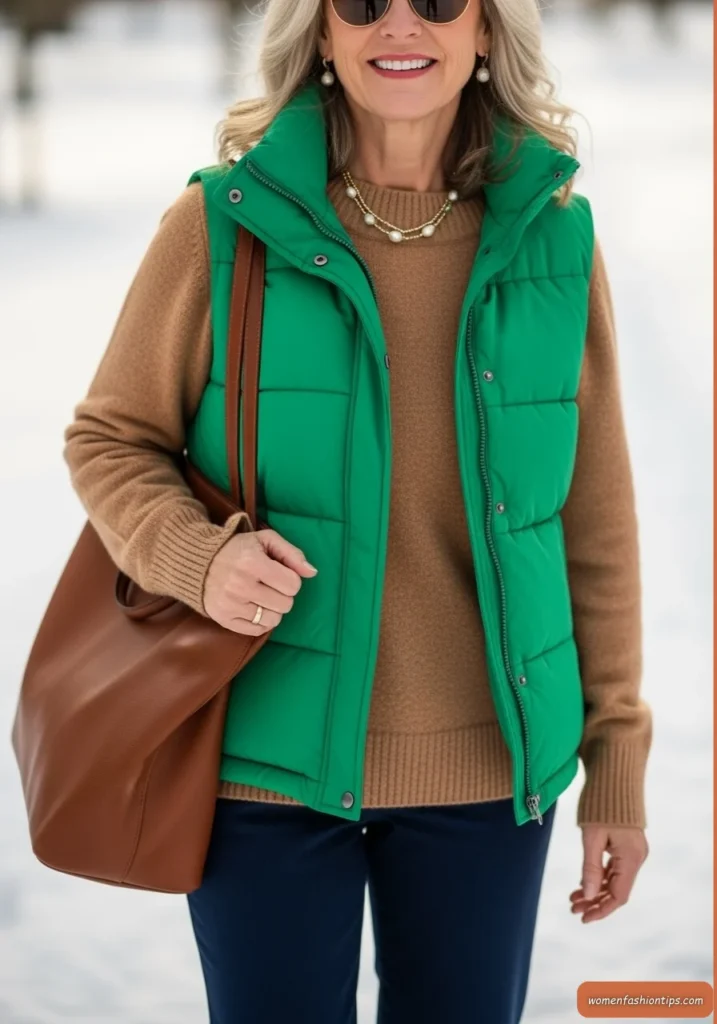 Weekend dressing gets an elevated treatment with this perfectly balanced ensemble that manages to be both casual and polished. The bright green puffer vest adds a pop of energizing color while providing practical warmth for outdoor activities. Paired with a rich camel sweater and navy pants, the color combination is both sophisticated and cheerful, proving that weekend wear doesn’t have to be boring or sloppy.
