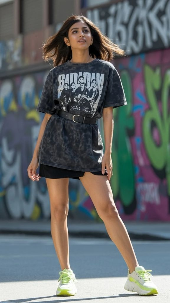 This is the look that stops me in my tracks every time I see it on the street. An oversized vintage-style band tee — in this case, a dark, acid-washed piece with a retro graphic — cinched at the waist with a leather belt, worn over a barely visible black mini skirt. The tee is large enough to function almost as a dress on its own, but the belt creates definition and shape, turning what could be shapeless into something sculptural. And those neon green sneakers? They inject the kind of energy that makes people look twice. This is baggy summer streetwear at its most expressive and fearless.