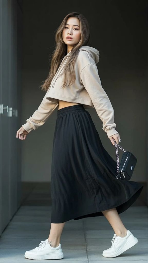 Neutral tones have a quiet confidence that loud colors can’t replicate, and this outfit is the proof. A beige cropped hoodie with a relaxed, slightly boxy fit sits perfectly above a dark, flowing midi skirt that moves like water. The palette is muted — oatmeal and black — but the effect is anything but boring. There’s a minimalist sophistication here that elevates the oversized summer streetwear women are embracing this year into something almost architectural. The proportions are generous on both top and bottom, creating a columnar silhouette that’s surprisingly elongating, especially when paired with white platform sneakers that add height without sacrificing comfort.
