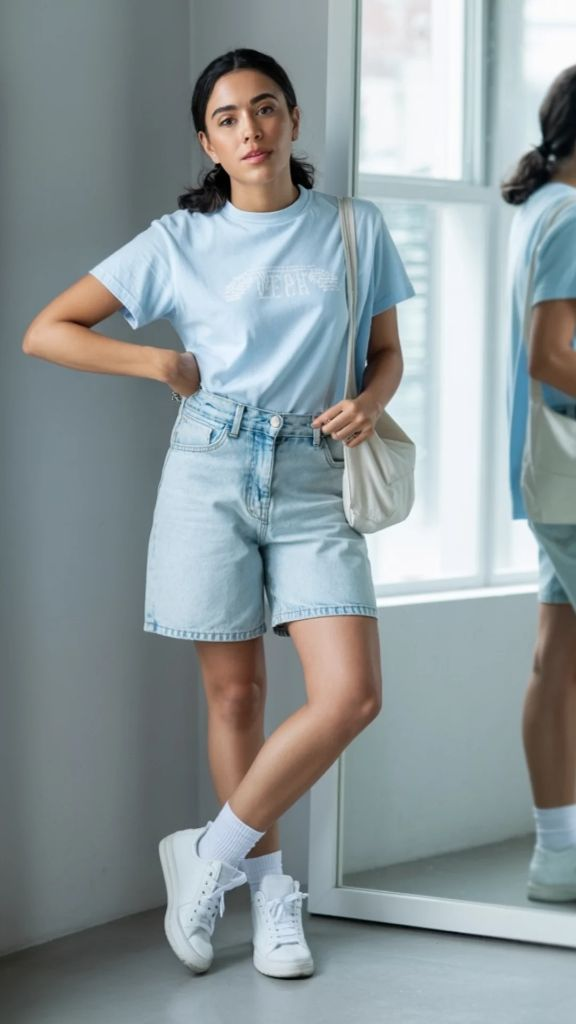 Monochrome dressing is one of the easiest ways to look polished without overthinking, and this soft baby blue outfit proves it effortlessly. A relaxed-fit light blue tee is tucked loosely into light wash denim shorts that hit at a comfortable mid-thigh length. The tones are close but not identical — the tee is a true sky blue while the shorts are a faded, sun-bleached denim — and that slight variation keeps the look interesting. White sneakers and a cream canvas tote bag complete the picture with a simplicity that feels quintessentially summer. This is one of those baggy summer outfits for women that makes getting dressed feel like a joy rather than a chore.