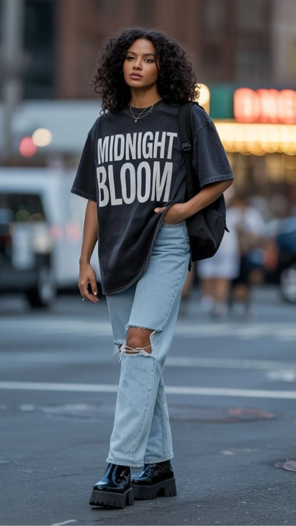 There are certain outfits that feel like a declaration. This is one of them. An oversized dark graphic tee — reading “MIDNIGHT BLOOM” in massive white letters — is worn untucked over light-wash ripped jeans with a wide, straight leg. The tee hits well below the waist, practically reaching mid-thigh, and the jeans are distressed at the knee with a raw, unfinished quality. Black chunky platform boots anchor the look with serious visual weight, and a dark backpack slung over one shoulder completes the ensemble. This is baggy streetwear at its most authentic — borrowing from skate culture, music culture, and downtown cool all at once.