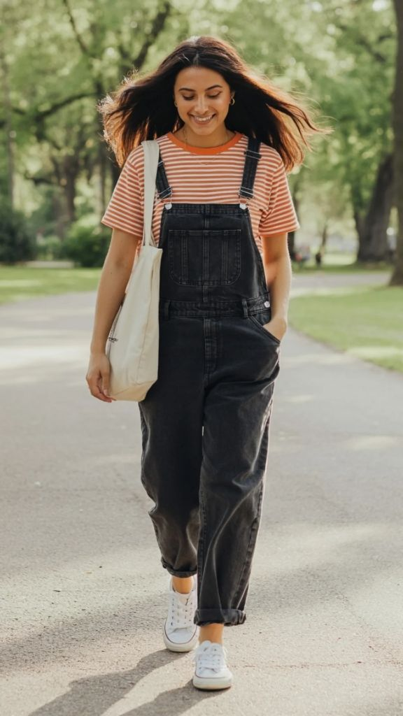 Overalls are the garment that never fully goes away, and in the context of summer street style for women in 2026, they’re having an especially good moment. Here, a pair of baggy black denim overalls is worn over an orange-and-white striped tee with a relaxed fit. The overalls are wide-legged and slightly long, pooling just above white Converse sneakers in a way that feels nostalgic and modern simultaneously. A cream canvas tote bag carried low adds to the laid-back energy. The stripes peeking out from beneath the bib create visual interest without requiring any additional accessories or jewelry.