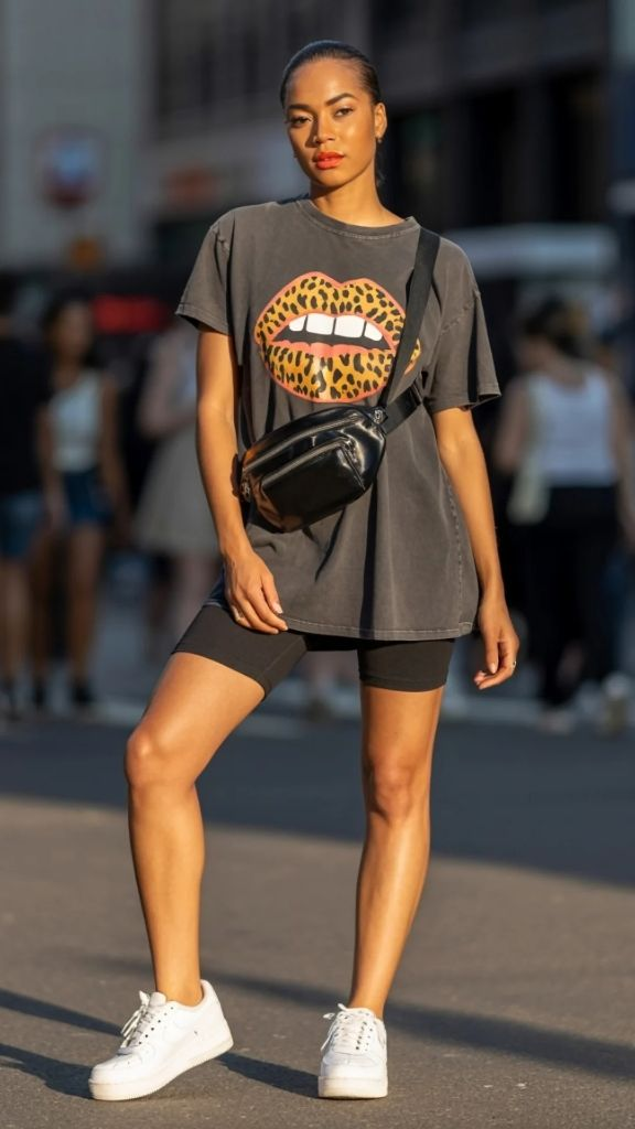 This outfit walks the line between athleisure and pure streetwear with total confidence. An oversized gray graphic tee featuring a bold leopard-print lips motif is paired with dark biker shorts and white sneakers. A black crossbody belt bag cuts across the torso diagonally, adding structure to the otherwise relaxed silhouette. The tee is washed and faded in a way that gives it instant vintage character, and the biker shorts provide a sleek counterpoint to all that volume on top. This is oversized streetwear fashion that’s playful, punchy, and absolutely ready for summer sidewalks.
