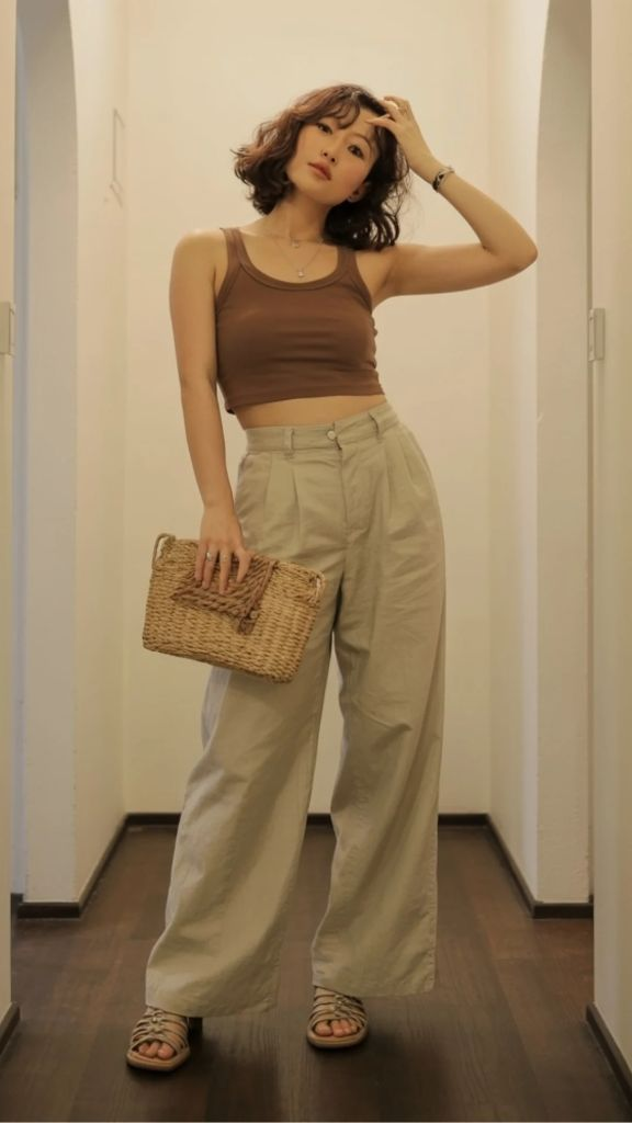There’s a warmth to earth tones that feels deeply aligned with summer — like sun-baked clay, like dry grass, like sand between your toes. This outfit channels that energy perfectly. A brown fitted tank top in a ribbed knit is paired with cream wide-leg trousers that have a high waist and a generous, flowing leg. The trousers are the real statement, with deep pleats that create beautiful movement and volume. A woven straw clutch and strappy flat sandals in warm tan tones complete the palette. This is baggy summer streetwear that leans into softness and sophistication, proving that relaxed silhouettes can be deeply elegant.