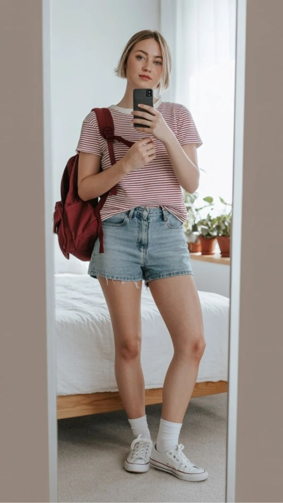 Stripes and denim are a combination as old as summer itself, and this outfit pays homage to that timelessness while keeping things fresh. A red-and-white striped tee with a slightly relaxed fit is paired with classic light-wash denim cutoffs — the kind with raw hems and a mid-rise waist that sit exactly where they should. White Converse sneakers with crew socks and a burgundy backpack complete the look with a color harmony that feels almost Parisian in its understated coordination. This is baggy summer streetwear that channels a breezy, carefree energy — the kind of outfit you throw on without thinking and somehow look perfect in.