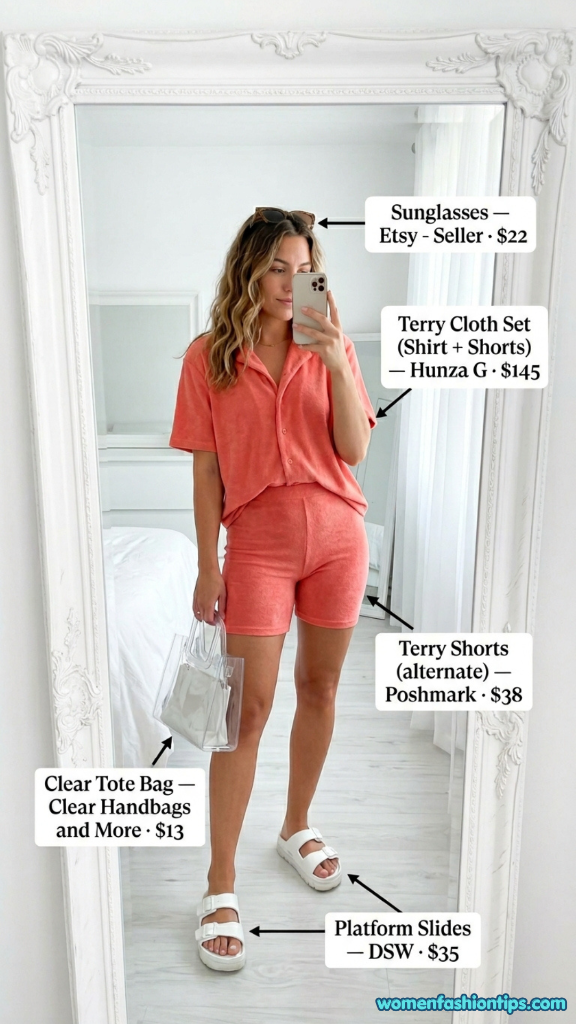 Shop This Look: The Terry Cloth Set (Shirt + Shorts) is from Hunza G at $145 — shop it here. The Sunglasses are from an Etsy seller at $22 — browse similar styles here. The Terry Shorts (alternate) can be found on Poshmark for $38 — check them out here. The Clear Tote Bag is from Clear Handbags and More at $13 — grab it here. And the Platform Slides from DSW at $35 — find them here.