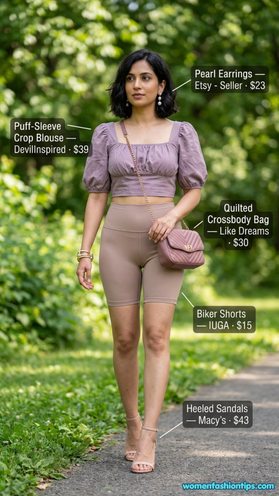 Shop This Look: The Puff-Sleeve Crop Blouse is from DevilInspired at $39 — shop it here. The Pearl Earrings are from an Etsy seller at $23 — find similar pairs here. The Quilted Crossbody Bag by Like Dreams is $30 — grab it here. The Biker Shorts from IUGA are $15 — snag them here. And the Heeled Sandals from Macy’s at $43 — shop them here.