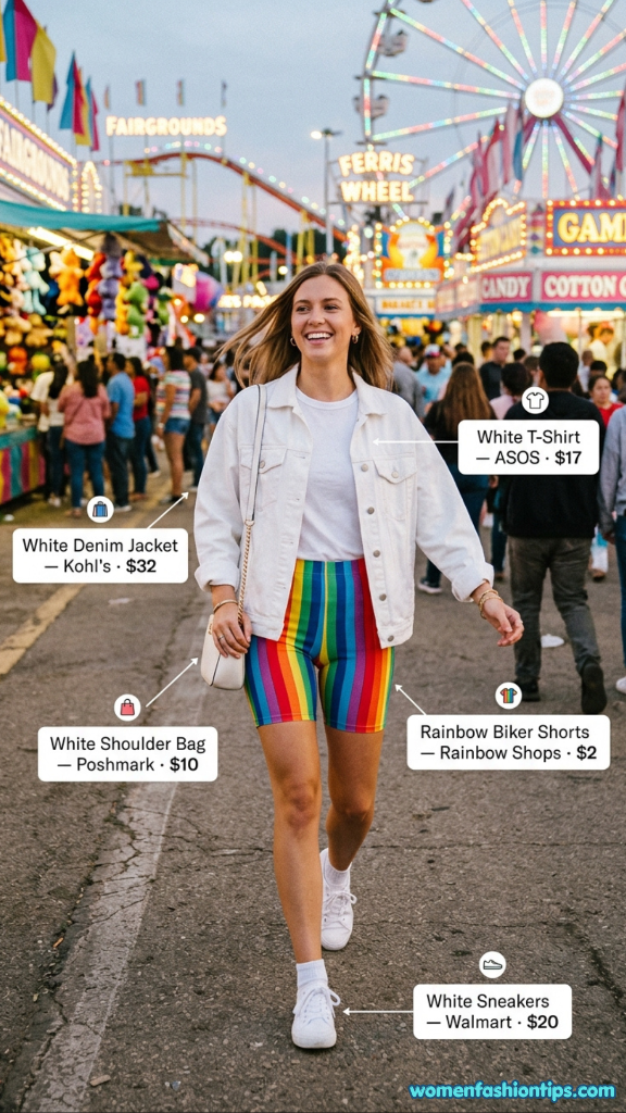 The key to pulling off a bold print like rainbow stripes is grounding everything else in neutrals. The white ASOS tee acts as a clean canvas, while the Kohl’s white denim jacket adds just enough structure to keep the look from feeling like activewear. For footwear, simple white sneakers from Walmart keep the vibe approachable and comfortable — essential when you’re walking around a fair all evening. Throw a small white shoulder bag across your body so your hands are free for cotton candy and Ferris wheel photos.