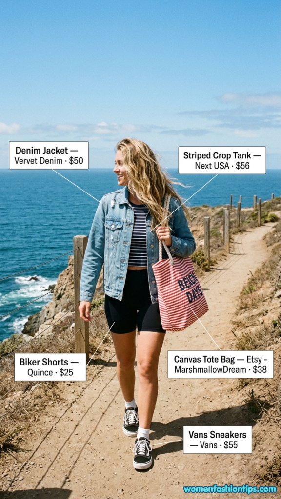 Wind in your hair, ocean stretching out to the horizon, and an outfit that feels like it was made for this exact moment. The combination of a classic denim jacket with a navy-and-white striped crop tank and black biker shorts is effortlessly coastal — the kind of look that works whether you’re hiking a cliffside trail or grabbing fish tacos by the pier. Summer biker shorts outfits women thrive when they balance sporty and casual like this.