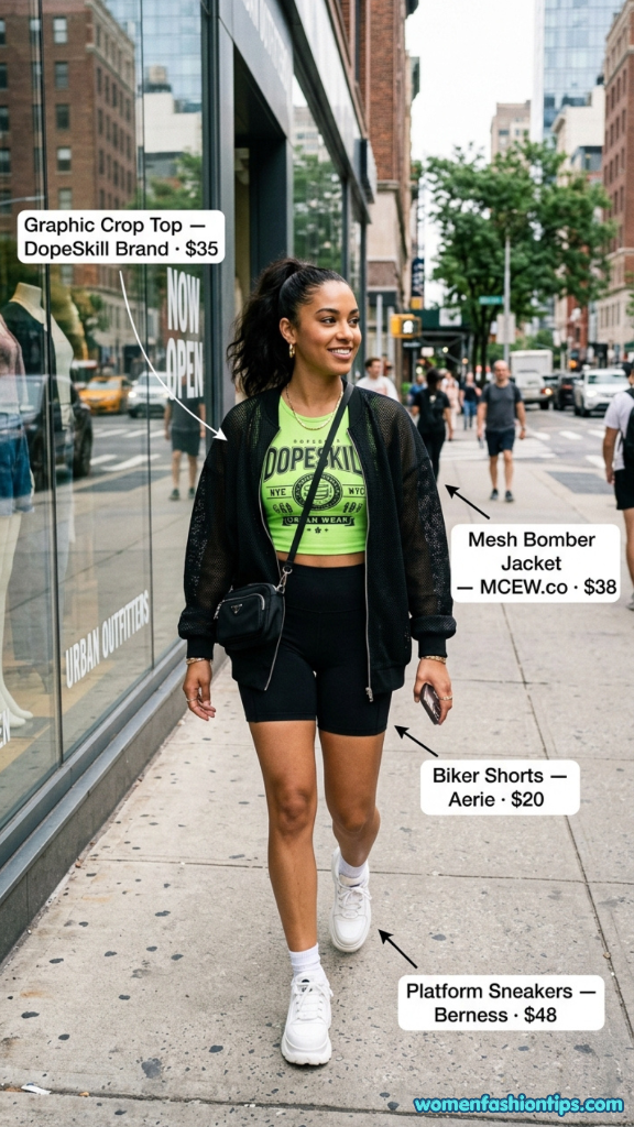 Shop This Look: The Graphic Crop Top is from DopeSkill Brand at $35 — shop it here. The Mesh Bomber Jacket from MCEW.co is $38 — find it here. The Biker Shorts from Aerie are $20 — grab them here. And the Platform Sneakers from Berness at $48 — shop them here.