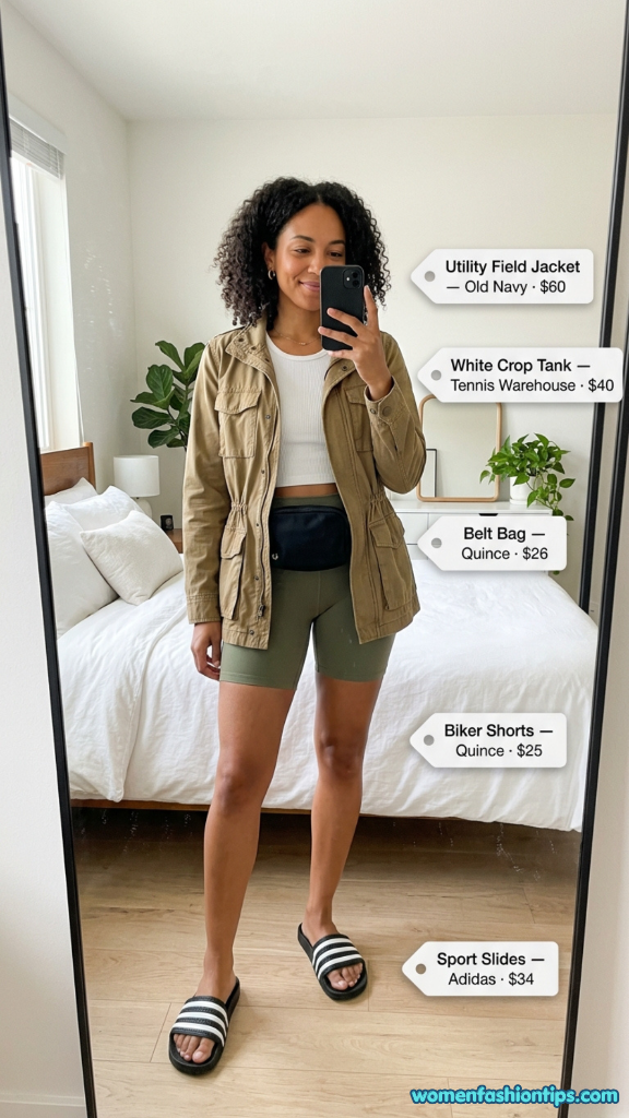 Shop This Look: The Utility Field Jacket is from Old Navy at $60 — shop it here. The White Crop Tank from Tennis Warehouse is $40 — find it here. The Belt Bag from Quince is $26 — grab it here. The Biker Shorts from Quince are $25 — shop them here. And the Sport Slides from Adidas at $34 — find them here.