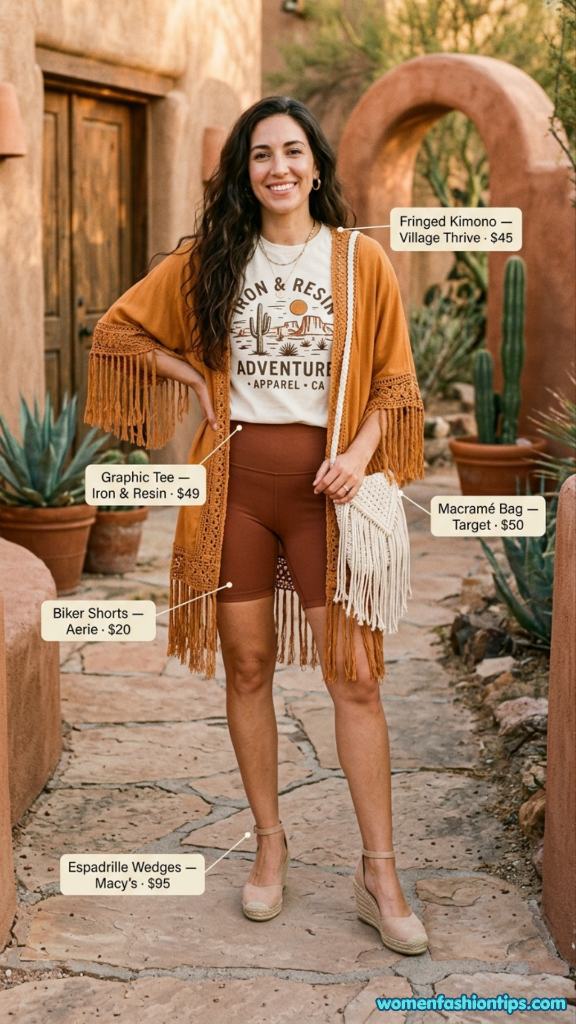 Village Thrive makes fringed kimonos with crochet-lace detailing that look artisanal and handmade. The Iron & Resin graphic tee underneath adds a vintage Americana vibe that plays perfectly against the boho outer layer. Aerie’s biker shorts in a rich chocolate brown are the unsung hero here — the color elevates the entire outfit beyond basic black. A macramé crossbody bag from Target adds another textural layer, and espadrille wedges from Macy’s provide height while keeping the earthy aesthetic intact.