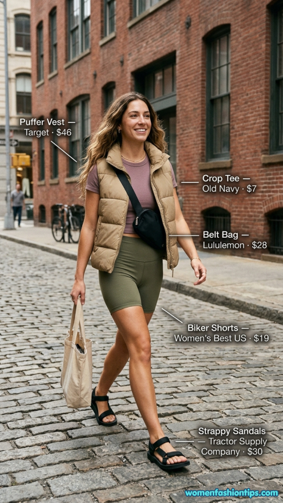 Shop This Look: The Puffer Vest from Target is $46 — shop it here. The Crop Tee from Old Navy is just $7 — find it here. The Belt Bag from Lululemon is $28 — grab it here. The Biker Shorts from Women’s Best US are $19 — shop them here. And the Strappy Sandals from Tractor Supply Company at $30 — check them out here.