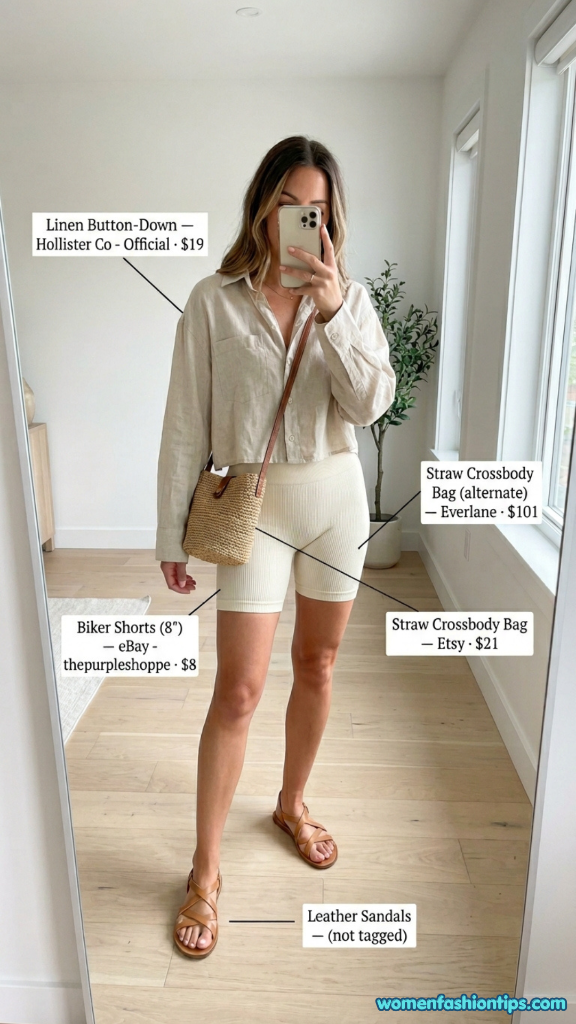 Hollister Co. has quietly become a solid source for affordable linen pieces, and their button-down at nineteen dollars is genuinely impressive for the quality. The biker shorts from eBay seller thepurpleshoppe are just eight dollars and feature a ribbed texture that elevates them beyond basic cotton. The straw crossbody bag from Etsy at twenty-one dollars is the kind of piece that makes the whole outfit feel vacation-ready, while the Everlane alternate at one hundred and one dollars offers a more structured version for those who want to invest. Leather sandals pull the entire look together with warmth and sophistication.