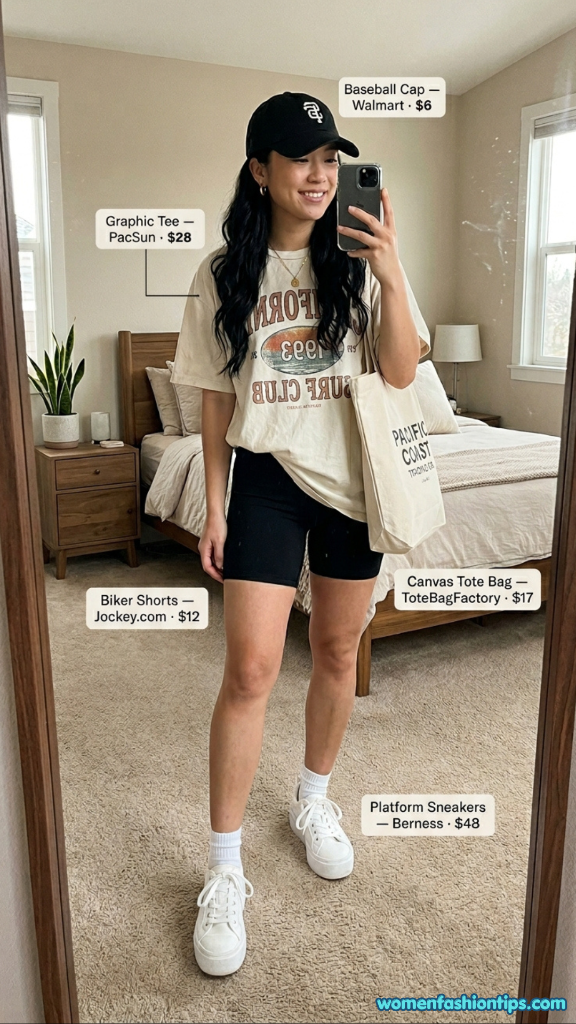 Shop This Look: The Baseball Cap from Walmart is $6 — shop it here. The Graphic Tee from PacSun is $28 — find it here. The Biker Shorts from Jockey.com are $12 — grab them here. The Canvas Tote Bag from ToteBagFactory is $17 — check it out here. And the Platform Sneakers from Berness at $48 — shop them here.