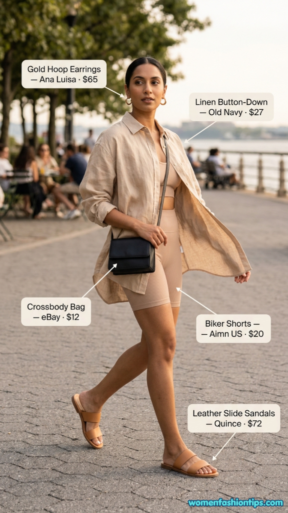There’s a reason the linen-and-biker-shorts combination keeps appearing in this roundup — it’s because it works, every single time. This particular version pairs an open beige linen button-down over a nude crop top and matching nude biker shorts, creating a skin-tone-adjacent palette that’s both daring and incredibly elegant. The gold hoop earrings catch the afternoon light, the crossbody bag adds a structured counterpoint, and the leather slide sandals feel like they were made for sunset walks along a promenade. Casual bike shorts fashion outfits rarely look this refined.