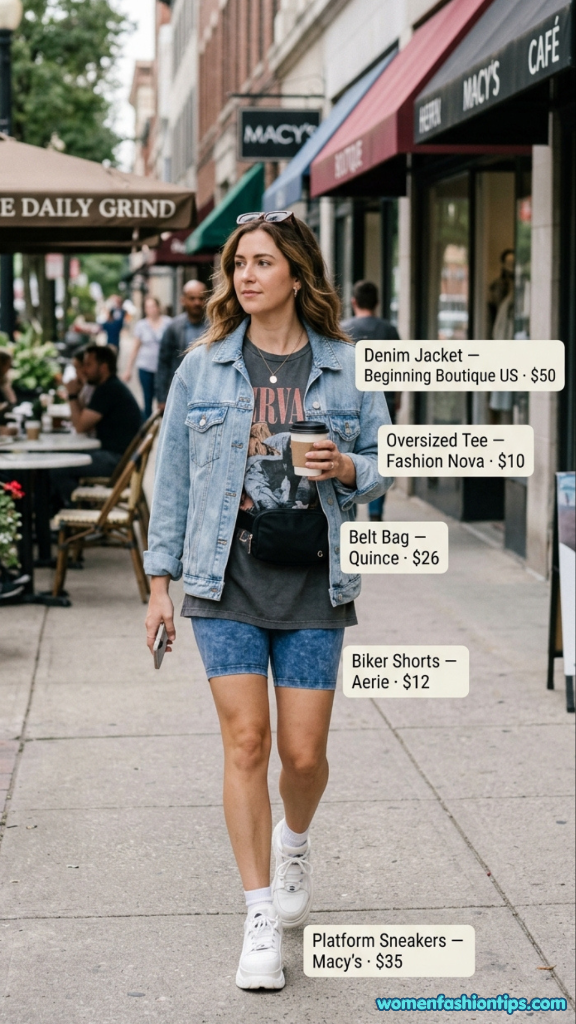 Shop This Look: The Denim Jacket from Beginning Boutique US is $50 — shop it here. The Oversized Tee from Fashion Nova is $10 — find it here. The Belt Bag from Quince is $26 — grab it here. The Biker Shorts from Aerie are $12 — check them out here. And the Platform Sneakers from Macy’s at $35 — shop them here.