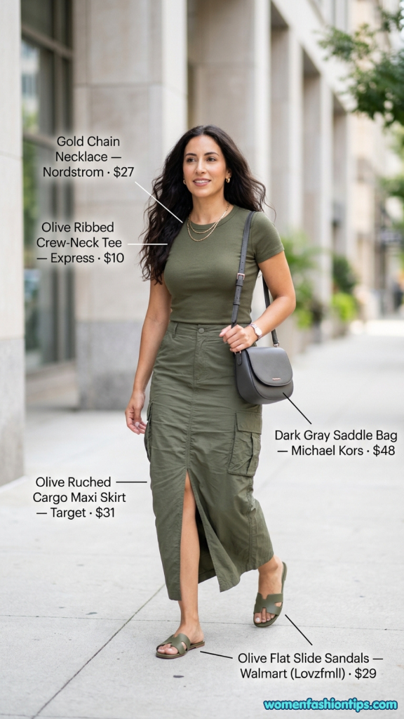 Shop This Look: The Olive Ribbed Crew-Neck Tee is from Express at $10 — shop it here. The Olive Ruched Cargo Maxi Skirt by Target for $31 — grab it here. The Gold Chain Necklace from Nordstrom at $27 — find it here. The Dark Gray Saddle Bag by Michael Kors for $48 — shop it here. And the Olive Flat Slide Sandals from Walmart (Lovzfmll) at $29 — snag them here.
