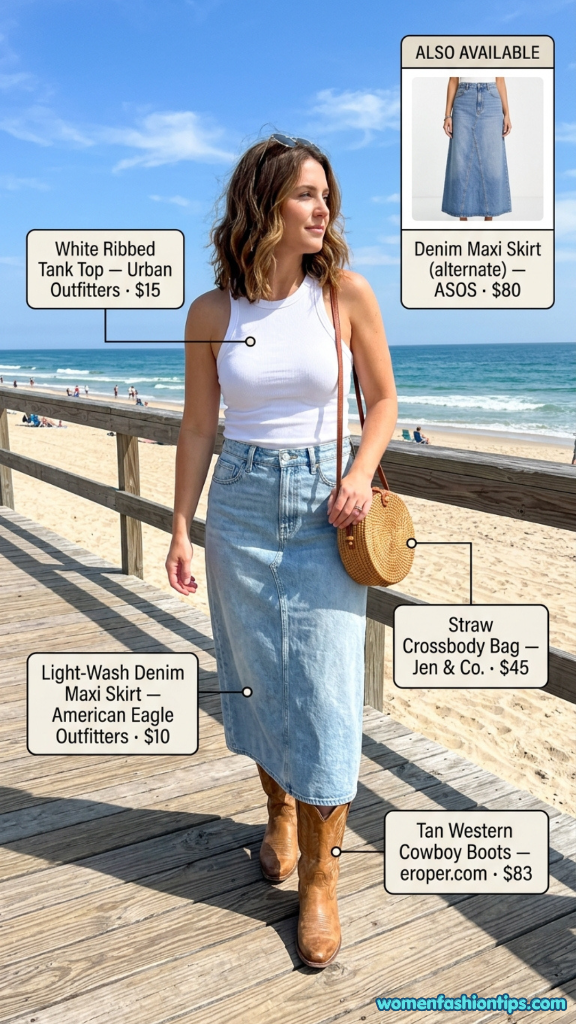 If there’s one summer maxi skirt outfit idea that captures the spirit of coastal Americana, it’s this one. A light-wash denim maxi skirt paired with a crisp white ribbed tank top and tan cowboy boots feels like a love letter to long boardwalk evenings and salty ocean breezes. The denim has that perfectly faded quality — soft, relaxed, and a little bit vintage — while the white tank keeps everything fresh and clean. It’s the kind of look that photographs beautifully against a beach backdrop, but honestly works just as well at a weekend brunch.