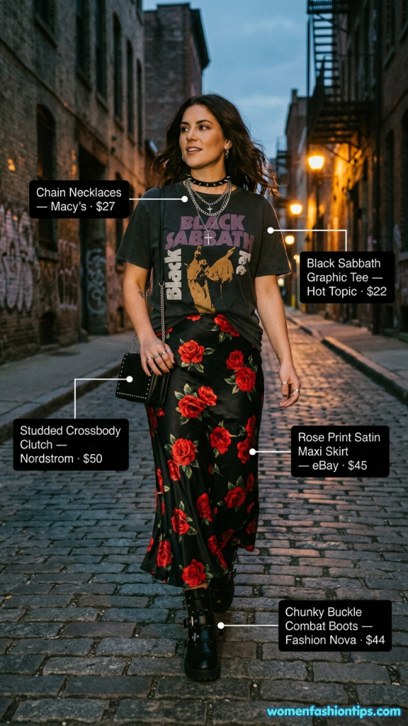 Shop This Look: The Black Sabbath Graphic Tee is from Hot Topic at $22 — shop it here. The Rose Print Satin Maxi Skirt from eBay for $45 — find it here. The Chain Necklaces from Macy’s at $27 — grab them here. The Studded Crossbody Clutch by Nordstrom for $50 — shop it here. And the Chunky Buckle Combat Boots from Fashion Nova at $44 — snag them here.