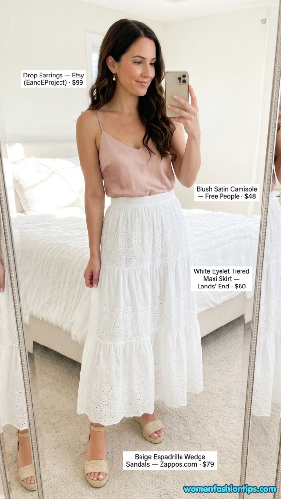 If summer had a favorite outfit, I think it might look something like this. A blush satin camisole with delicate spaghetti straps paired with a white eyelet tiered maxi skirt — it’s romantic, feminine, and absolutely dreamy. The eyelet detail on the skirt adds texture and visual depth, while the tiers create gentle movement with every step. This is the kind of casual maxi skirt outfit that transitions seamlessly from a daytime garden party to a sunset dinner without needing a single wardrobe change.