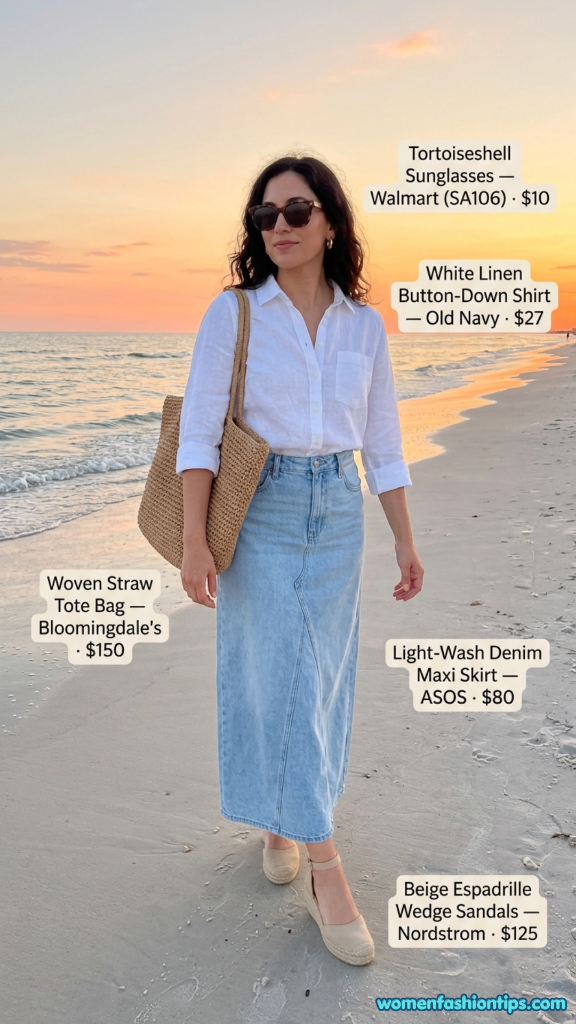 There are outfits you plan and outfits that seem to plan themselves, and this one falls firmly in the second category. A white linen button-down shirt with the sleeves casually rolled up, tucked loosely into a light-wash denim maxi skirt, beige espadrille wedge sandals, a woven straw tote, and tortoiseshell sunglasses — it’s the effortless beach-to-dinner look I reach for mentally every time I pack for a coastal getaway. The linen shirt catches the breeze and the denim maxi grounds everything in casual cool. This is summer maxi skirt outfit perfection.