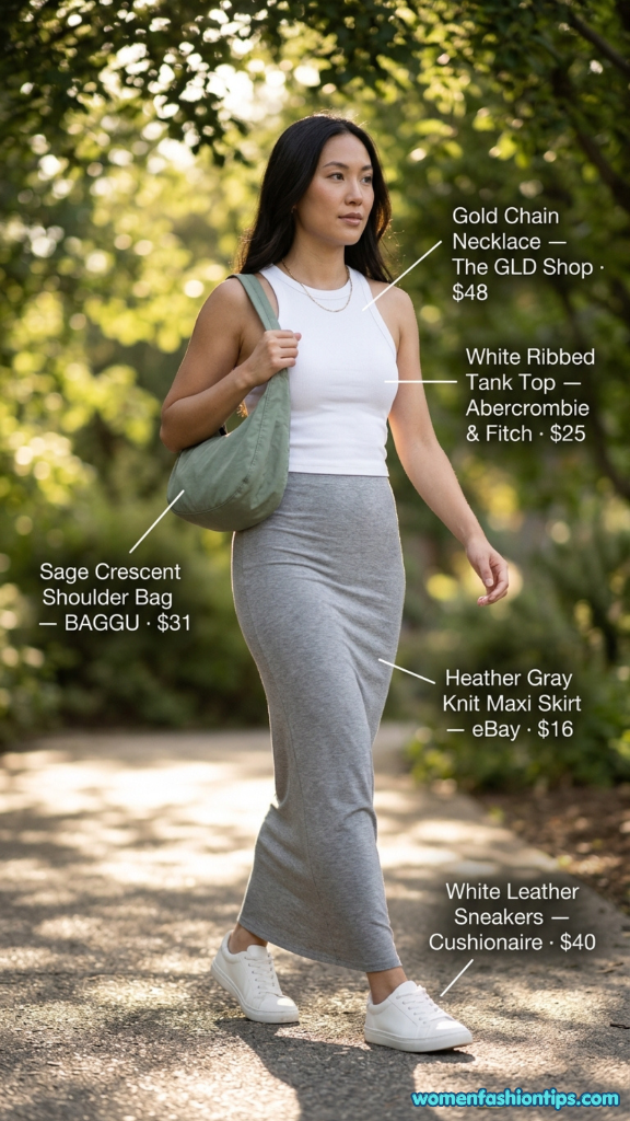 Shop This Look: The Gold Chain Necklace is from The GLD Shop at $48 — shop it here. The White Ribbed Tank Top by Abercrombie & Fitch for $25 — grab it here. The Sage Crescent Shoulder Bag from BAGGU at $31 — find it here. The Heather Gray Knit Maxi Skirt from eBay for $16 — shop it here. And the White Leather Sneakers from Cushionaire at $40 — snag them here.