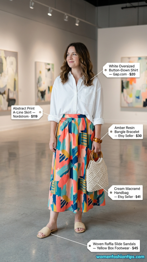 The Gap.com oversized button-down at $20 is a steal — wear it tucked in at the front and left loose at the back for that perfectly undone look. The abstract print skirt from Nordstrom at $119 is an investment piece, but the print is so unique that it essentially functions as wearable art. An amber resin bangle bracelet adds a warm, sculptural accent, and a cream macramé handbag keeps the texture story going. Woven raffia slide sandals complete the artistic sensibility.