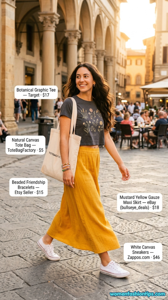 Target’s botanical graphic tees are consistently one of their best seasonal offerings — they’re soft, they wash well, and the prints feel considered rather than generic. The mustard gauze skirt from eBay is an absolute gem at $18. White canvas sneakers from Zappos.com, like a classic Converse style, keep the outfit grounded and casual. A natural canvas tote bag from ToteBagFactory at just $5 is the ultimate budget-friendly accessory, and beaded friendship bracelets add a whimsical, handmade touch.