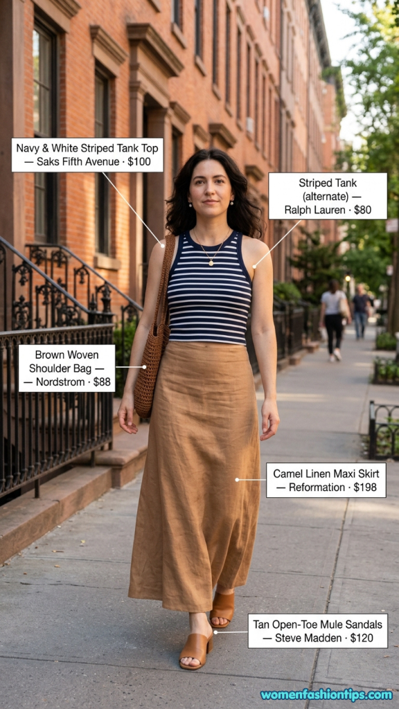 The Reformation camel linen maxi skirt at $198 is a splurge, but Reformation’s linen quality is genuinely exceptional — it softens beautifully over time and the cuts are consistently flattering. For the striped tank, Saks Fifth Avenue’s option at $100 offers a premium fit, though Ralph Lauren’s alternate at $80 is equally polished. Tan open-toe mule sandals from Steve Madden in a warm leather tone echo the camel of the skirt, and a brown woven shoulder bag from Nordstrom ties the warm neutrals together.