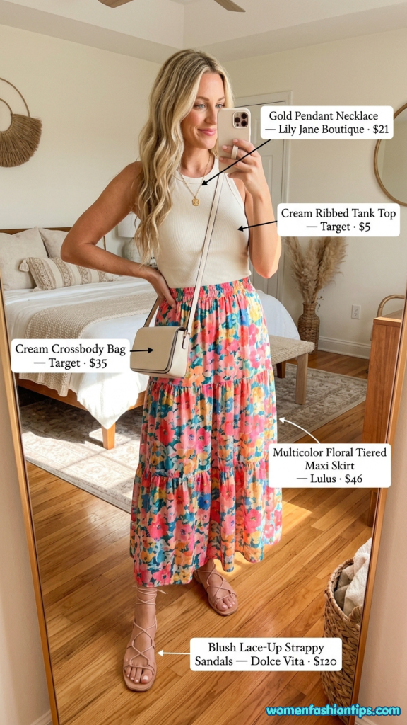 Target’s cream ribbed tank top at just $5 is honestly one of the best basics in the game right now — it fits beautifully and layers effortlessly under everything. The floral tiered maxi skirt from Lulus at $46 offers incredible value for such a statement piece. Blush lace-up strappy sandals from Dolce Vita add a feminine, slightly bohemian touch at $120. A cream crossbody bag from Target and a gold pendant necklace from Lily Jane Boutique round out the accessories.