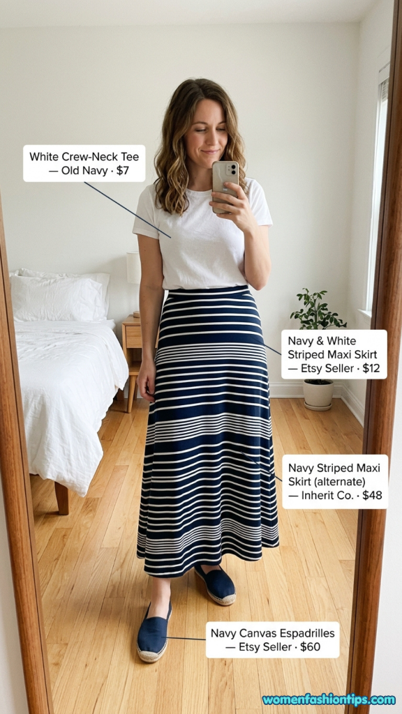 Old Navy’s white crew-neck tee at $7 is one of those legendary basics that consistently outperforms its price point. The navy and white striped maxi skirt from an Etsy seller at just $12 is a remarkable find — soft jersey knit that’s comfortable all day. Navy canvas espadrilles at $60 add a polished finishing touch. The whole outfit comes in well under $80, which feels almost too good to be true for something this put-together.