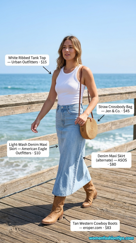 The coastal cowgirl aesthetic is not slowing down for 2026, and this outfit might be its most refined expression yet. A white ribbed tank top paired with a light-wash denim maxi skirt and tan western cowboy boots creates that irresistible tension between rugged and polished. A round straw crossbody bag hanging at the hip completes the beach-meets-ranch narrative. The ocean backdrop only amplifies what the outfit already communicates — freedom, warmth, and an adventurous spirit. This is one of those long skirt outfits for women in summer that feels both trendy and timeless.