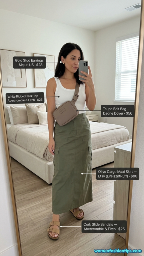 If the first olive cargo look was about head-to-toe monochrome ease, this one is about smart, hands-free practicality layered with subtle style. A white ribbed tank top from Abercrombie & Fitch paired with an olive cargo maxi skirt and a taupe belt bag creates an outfit that’s equal parts functional and fashionable. The belt bag — strapped across the chest — adds a sporty, modern element that feels very 2026. Gold stud earrings and cork slide sandals round things out with warmth and texture. This is one of my favorite casual maxi skirt outfits because it works for full days when you’re on the move.