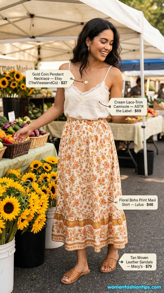 ASTR the Label consistently delivers on that elevated bohemian aesthetic, and their cream lace-trim camisole at $69 is a piece that works far beyond just this outfit. The Lulus floral boho maxi skirt at $46 is generous in its sweep and falls at a comfortable length. Tan woven leather sandals from Macy’s at $79 add artisanal texture. And the gold coin pendant necklace from Etsy’s TheViewsandCo at $27 is the kind of delicate detail that catches light and compliments alike.