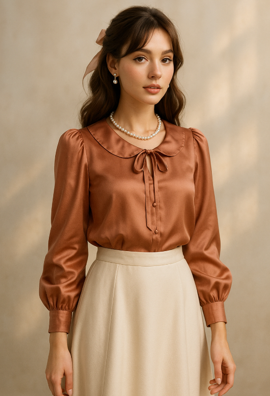 The Coquette aesthetic has emerged as one of fashion’s most alluring trends, bridging the gap between dreamy vintage elegance and fresh, contemporary flair. Defined by an embrace of femininity, this look revels in delicate fabrics, romantic palettes, and nostalgic accents—modernized for the fashion-forward woman of today. In this ensemble, a terracotta silk blouse and flowing cream midi skirt create a harmony of earth and softness, perfect for summer soirées, afternoon teas, or simply expressing a timeless, sweet sophistication.